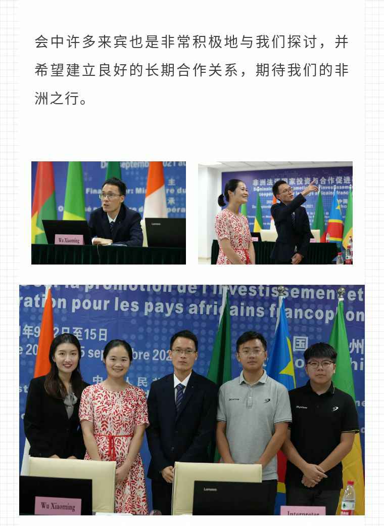 2021年9月6日,大连昊新网站优化与推广有限公司应福建省对外经济合作中心邀请,由非洲大区市场总监吴小铭作为代表与包括25位来自非洲法语国家经贸、投资促进政府部门官员及企业管理人员就疫情下中国企业如何应对机遇与挑战展开讨论。